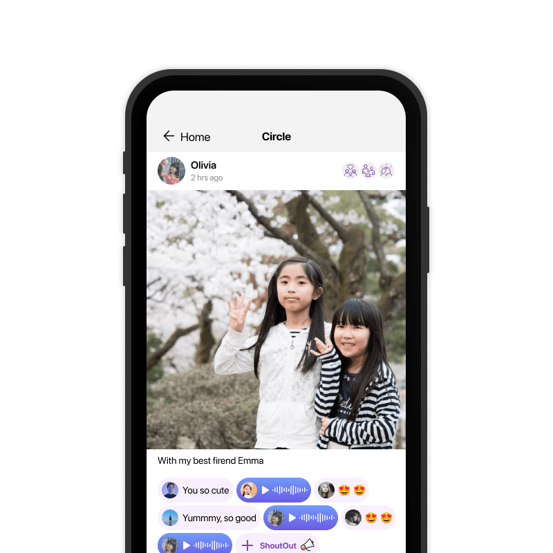 Combining the Comment, Reply, Reaction section into what we call "ShoutOut". Just like the "Thumbs Up" on Facebook or "Love" on Instagram, myFirst Circle has the "ShoutOut"!