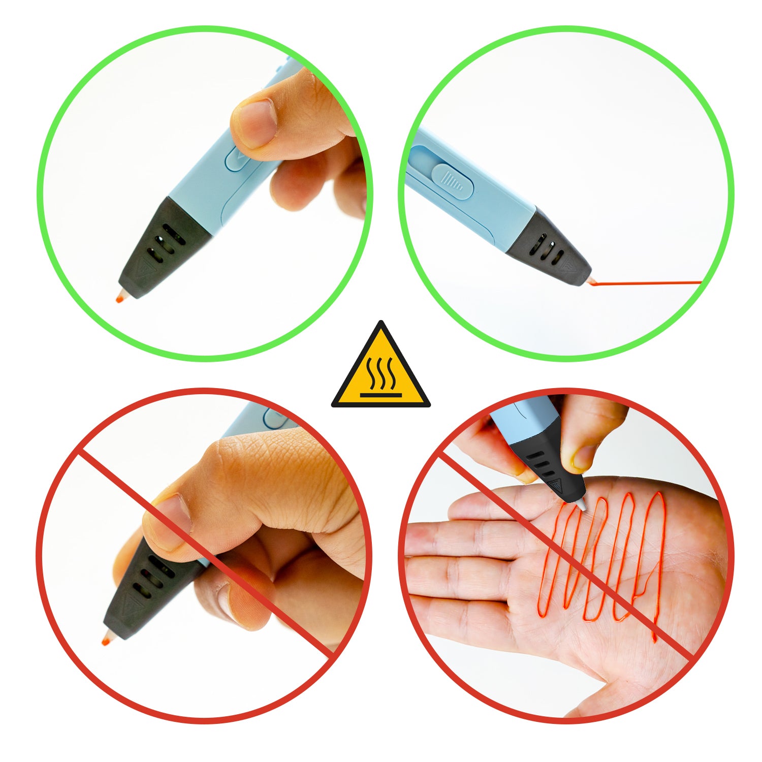 Never Draw on Skin: The pen's tip reaches high temperatures during use and can cause burns. While the filament itself is safe for skin contact, avoid drawing directly on your skin.