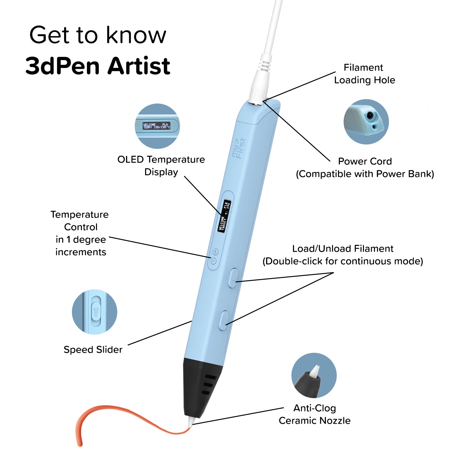 The myFirst 3dPen Artist uses PLA filament, a safe and biodegradable plastic commonly used in 3D printing. Compared to other filaments used in 3D printing, PLA melts at a lower temperature. This makes it ideal for 3D pens, as the pen itself doesn't need to get extremely hot.