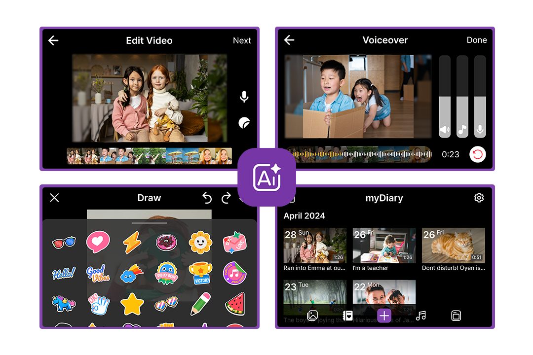 Our AI helps kids create amazing videos without the hassle. With simple tools and cool effects, they can add their own touch with stickers, drawings, and even their own voice!