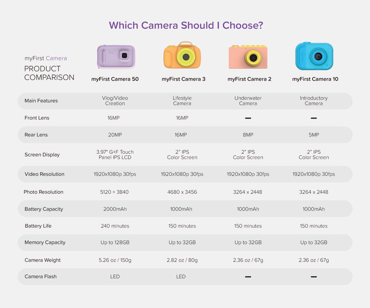 Camera 50 captures memories and connects families. Share photos and videos instantly with loved ones through our myFirst Circle app and all myFirst devices.