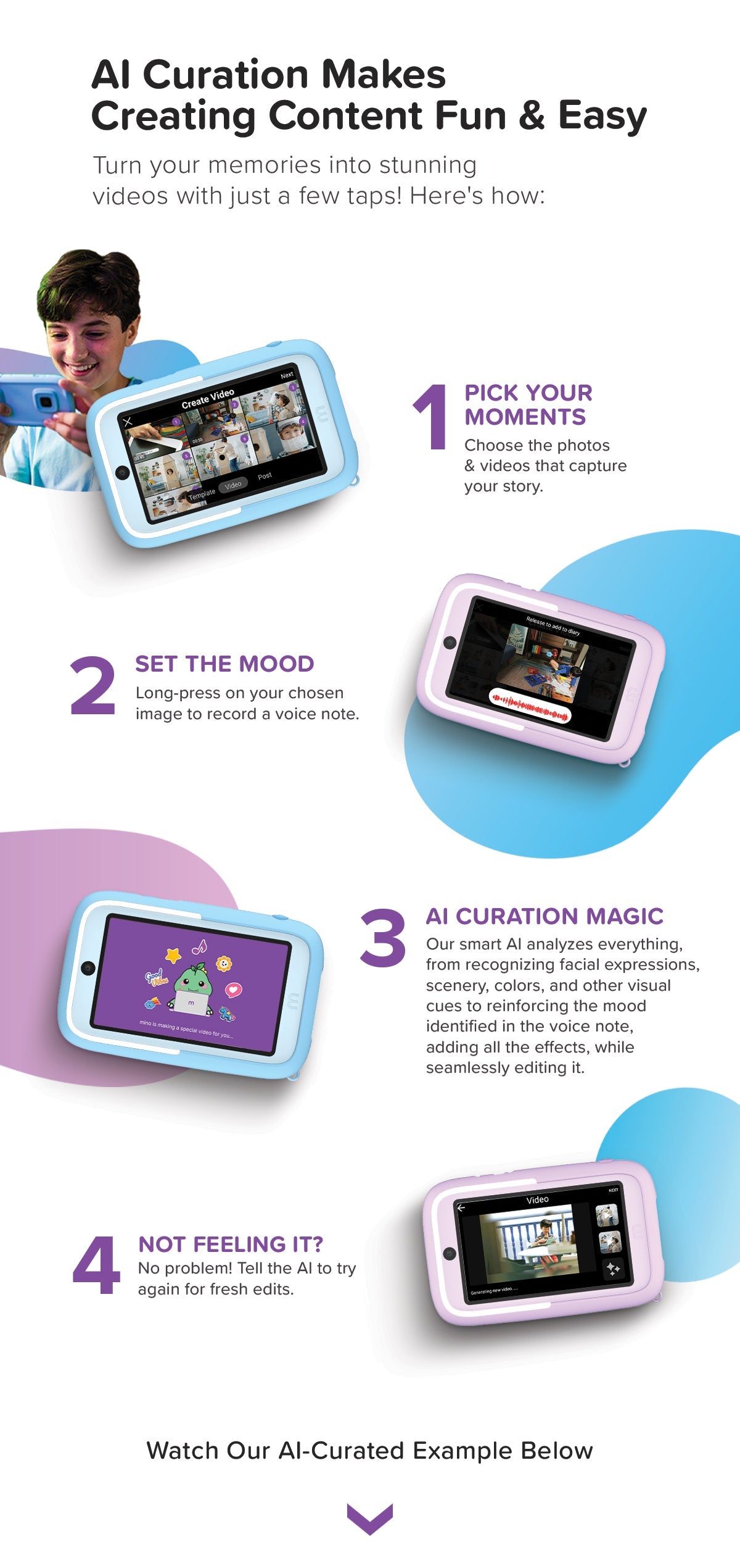 Our AI-assisted editing tools empower children to enhance their photos and videos with stickers, drawings, music, video or filters, fostering creativity and imagination. Our educational features provide hands-on learning experiences as children discover the art of photography.