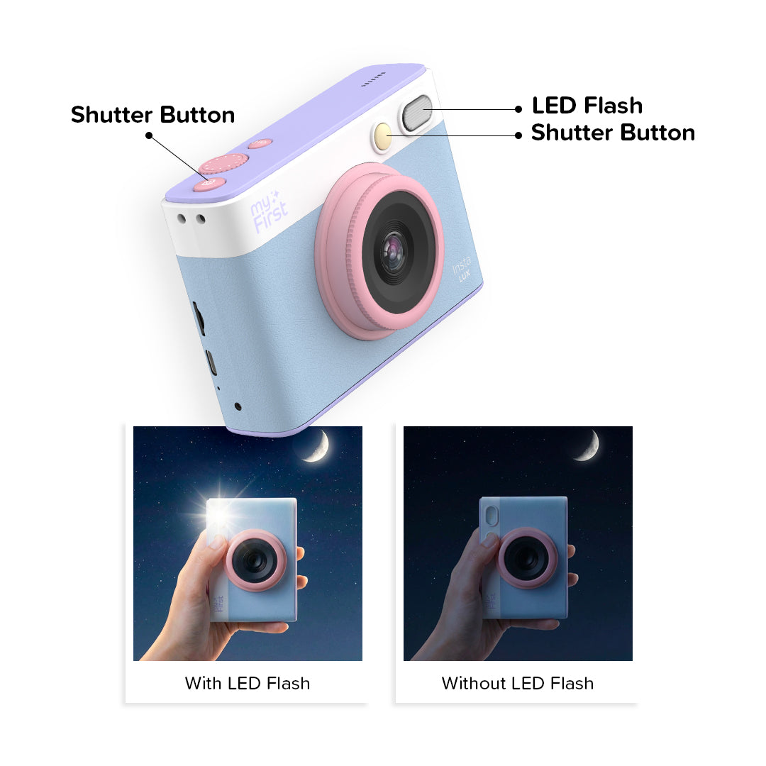 The myFirst Camera Insta Lux features an ergonomic button that's easy to press for a steady shot every time. The integrated LED flash provides a burst of natural light, ensuring your photos are bright and clear no matter the environment.